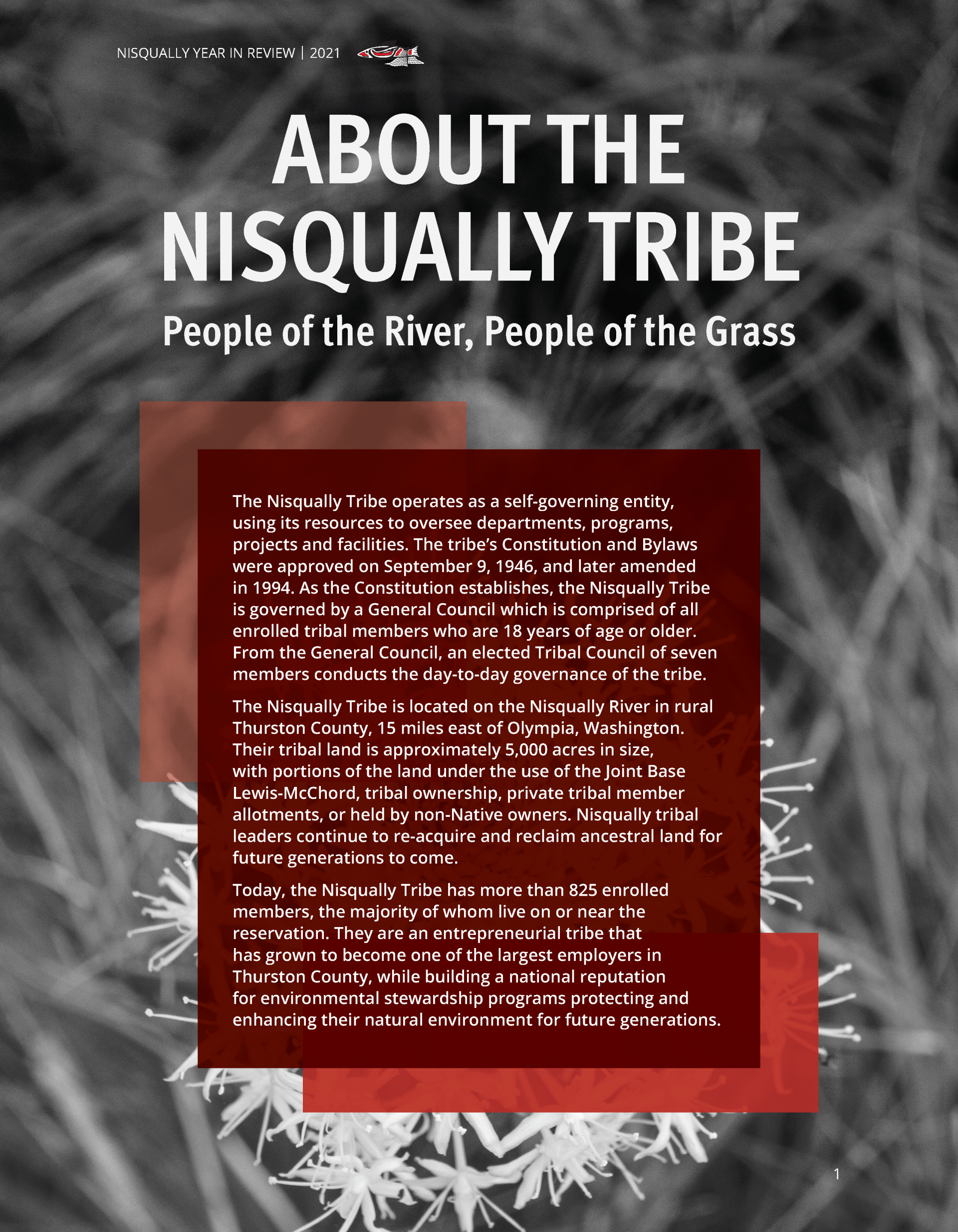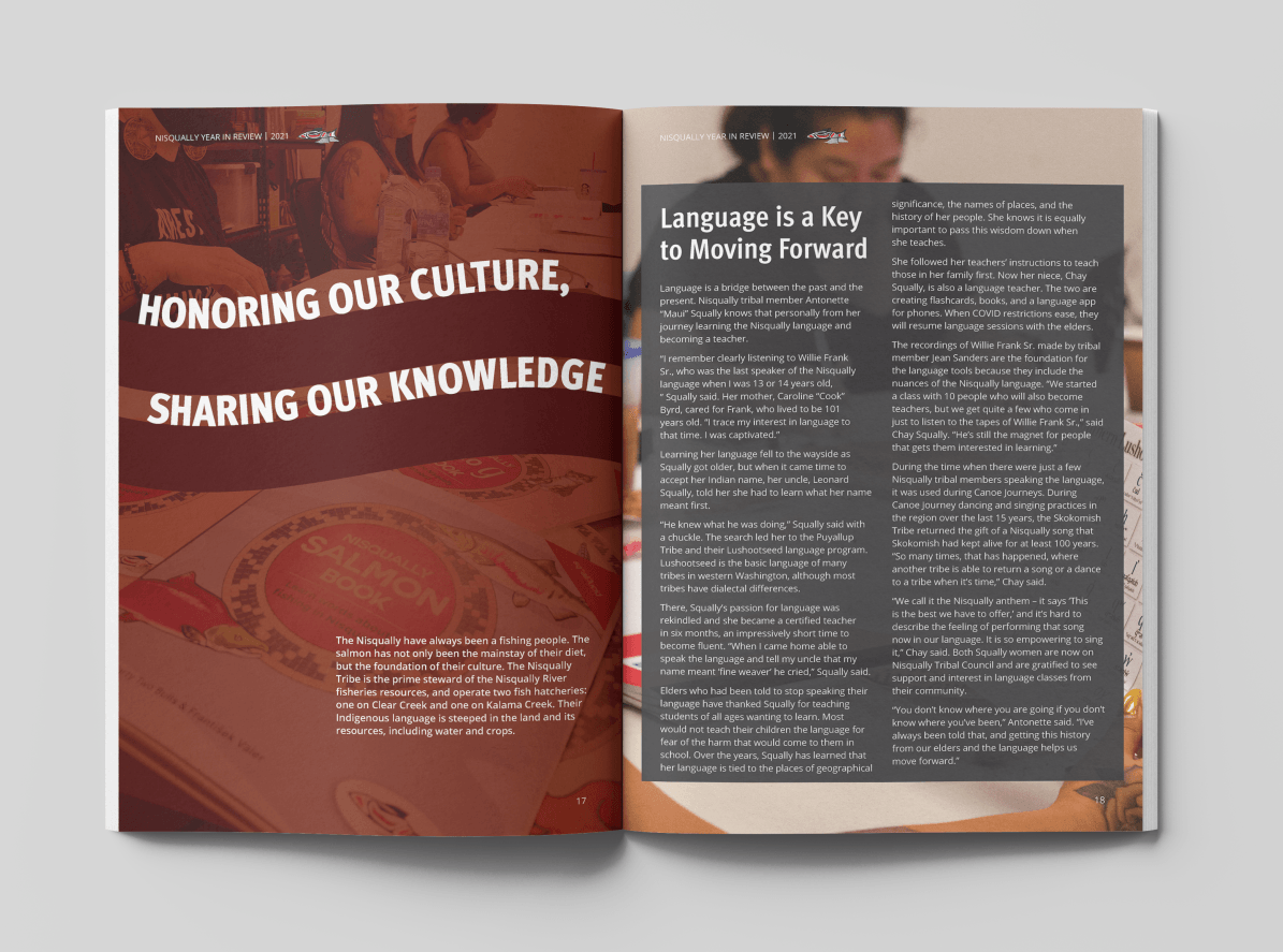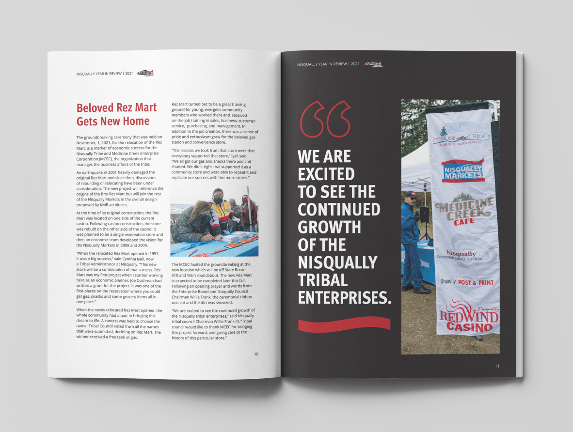 It was an honor to work with the Nisqually Tribal Council and Chairman to design a modern, fresh magazine highlighting the tribe's accomplishments over the past year. There were no existing brand guidelines or graphic elements - we were directed to use the logo and symbols of the tribe, such as the river, grasslands, and salmon, as inspiration for the overall design.