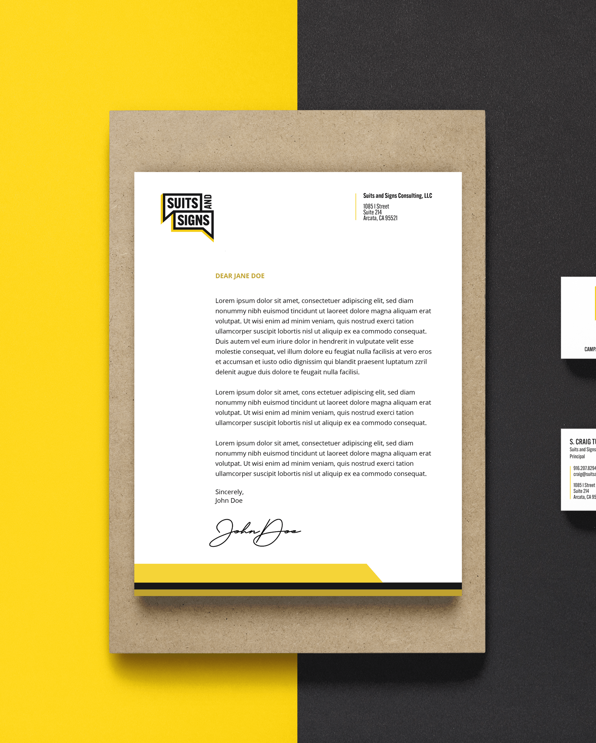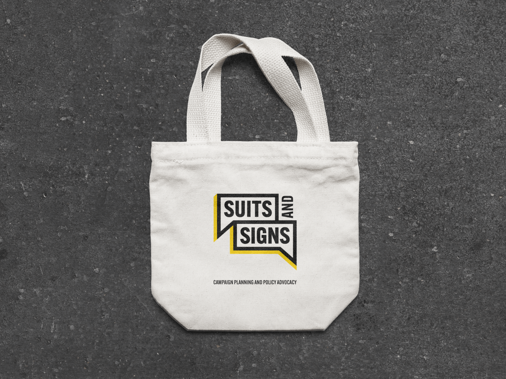 Suits and Signs Consulting is a campaign planning and policy advocacy business who came to us with desire for a refresh of their brand identity. We started with a punchy, bright, and bold logo that matched the company's assertive approach and voice. Next was applying it to print materials such as business cards, letterheads, and a tote bag.